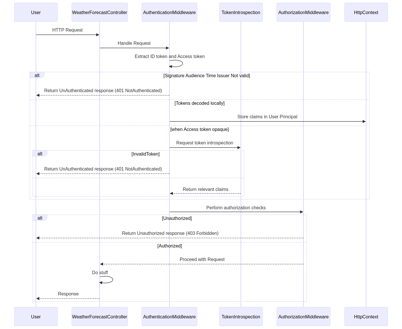Imagine a scenario where you have a WeatherForecastController in your application. Upon receiving an HTTP request, the middleware pipeline kicks in and performs tasks, such as authentication and authorization. The middleware responsible for handling authentication will extract and validate the ID token and access token from the request's headers or cookies.